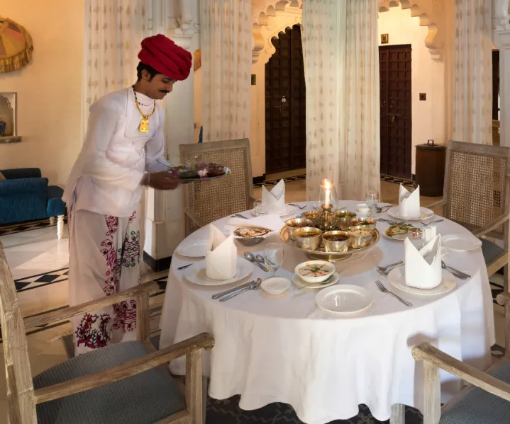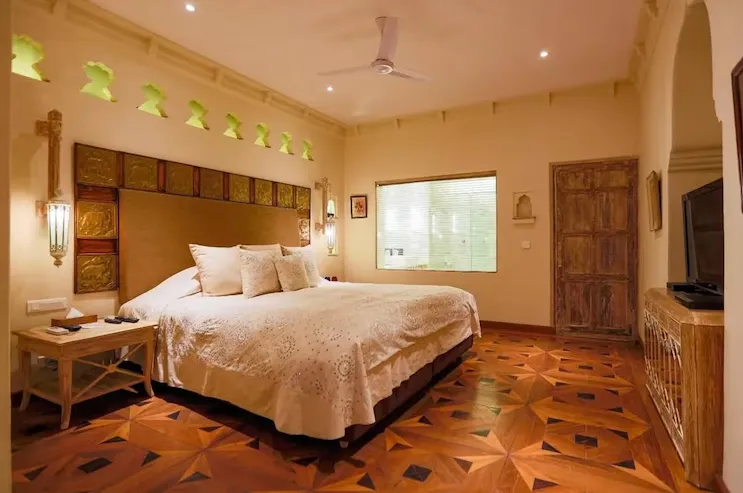 The stay experience feels personal rather than routine. Rooms are arranged to reflect traditional design influences, with spacious layouts, handcrafted elements, and views that connect guests to the rural Aravalli environment. Rather than focusing on volume, the property emphasizes atmosphere, helping guests slow down and enjoy where they are.